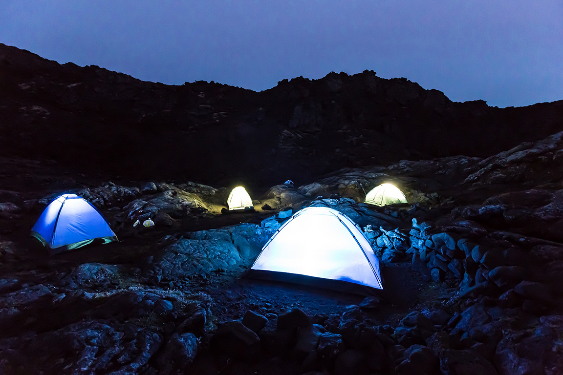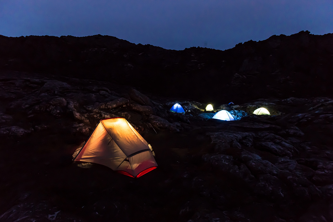 Start the 3-to-4-hour hike to the crater; set up the camping site.